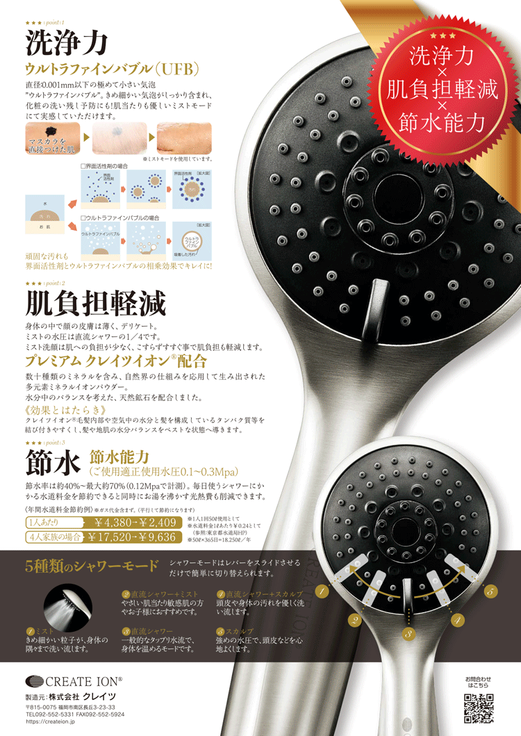 (人気ワードご紹介:浄水 節水 美髪 美肌 シャワー ヘッド 塩素除去シャワーヘッド セラミックボール カセット 活性炭フィルター付き きれいと きれーと キレイト マイクロバブル 敏感肌 お子様 直流シャワー+ミストモード スカルプモード ミストで洗う 多機能シャワーヘッド 美しく健康的な髪 肌 クレイツイオン ハンディシャワー IO霧(イオム) CIMSH-X01N ネジ規格 G1/2 プレミアムクレイツイオン ウルトラファインバブル シャワーヘッド ミスト洗浄 節水 5段階水流切替 他社シャワーヘッドホース用変換アダプター(3種)取付けがかんたん 工具不要 節水能力 クレイツ シャワーヘッド io霧)クレイツイオン シャワーヘッド ミストシャワーヘッド IO霧(イオム) 通販 〜CIMSH-X01N クレイツ 正規品〜 販売店:楽天イーエステshop ビューティーサイエンスから生まれた多機能シャワーヘッド ◆商品名:ミストシャワーヘッド【IO霧(イオム)】 ■モデル名:CIMSH-X01N ■節水能力:約40%〜最大約70%(流水水圧0.12Mpa時) ■サイズ:幅96.5x長さ234.5x高さ84.5mm ※本体ホース用ネジ表記:G 1/2 ■本体重量:165g(本体のみ) ■推奨使用温度:5 〜 45度 ■通水量:4.73 〜 9.08 / 分( 流動水圧0.12MPa にて計測) ■切り替え操作:5段階(レバースライド) ■付属品:他社シャワーヘッドホース用変換アダプター(3種)、説明書、保証書 ■原産国:中国 ■保証期間:購入日より1年 ■メーカー:株式会社シェリオン ●本品のホースとの接続ネジ径は、G1/2(じーにぶんのいち) です。